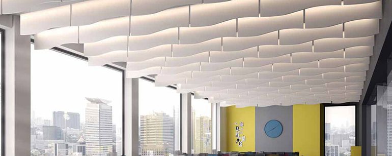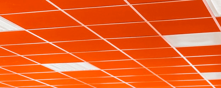 * Placas modulares de falsos techos de lana mineral o de lana de roca, integradas en la perfilería, de colores y acabados muy diversos
