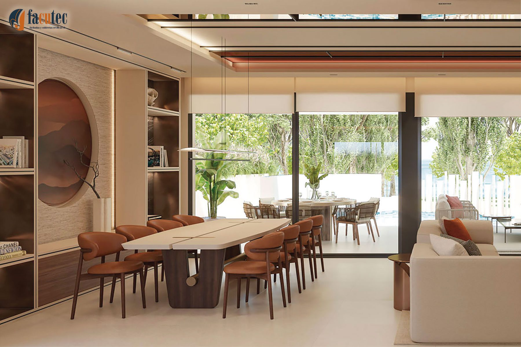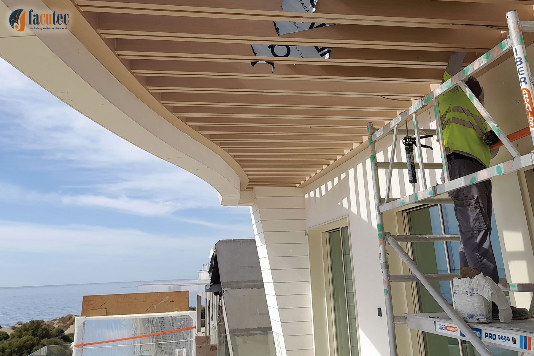 Otra actuación de nuestra instaladora Facutec en viviendas de alto standig, es nuestra participación en Marbella (Málaga) en la construcción de 32 exclusivas villas pareadas, conocidas como El Berrocal (Dunique) donde participamos en la instalación de unas pérgolas forradas de panel composite de aluminio que aporta a la obra una distinción y acabados muy especiales.