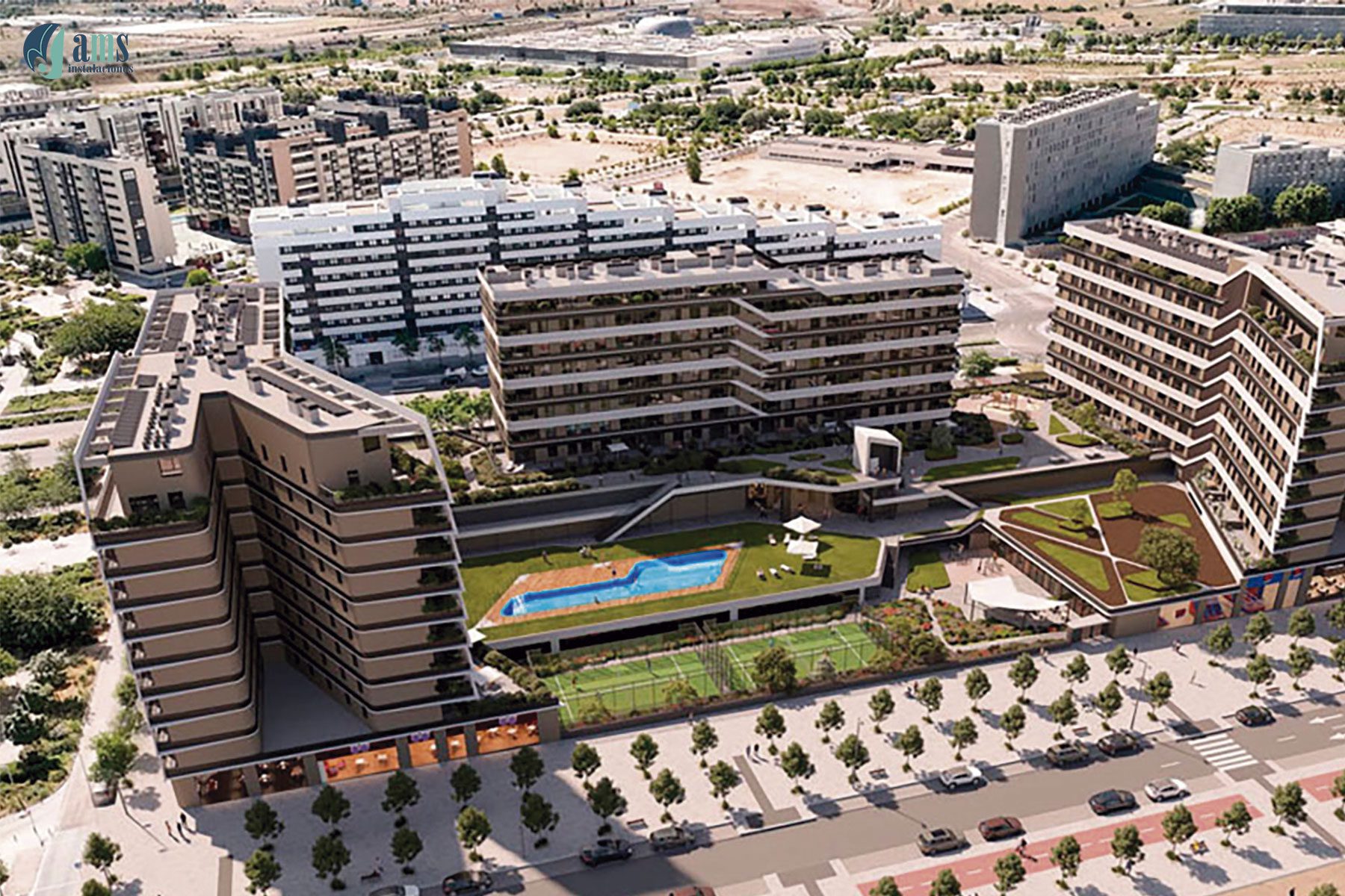 En el metropolitano distrito de Valdebebas de Madrid, nuestro grupo AMS participó a través de su instaladora AMS en la construcción de un exclusivo residencial de 395 viviendas, donde instalamos los sistemas de yeso laminado (tabiquería, trasdosados, falsos techos y preformados) así como los aislamientos asociados y las soluciones de protección pasiva contra inendios relacionadas con la compartimentación del edificio.