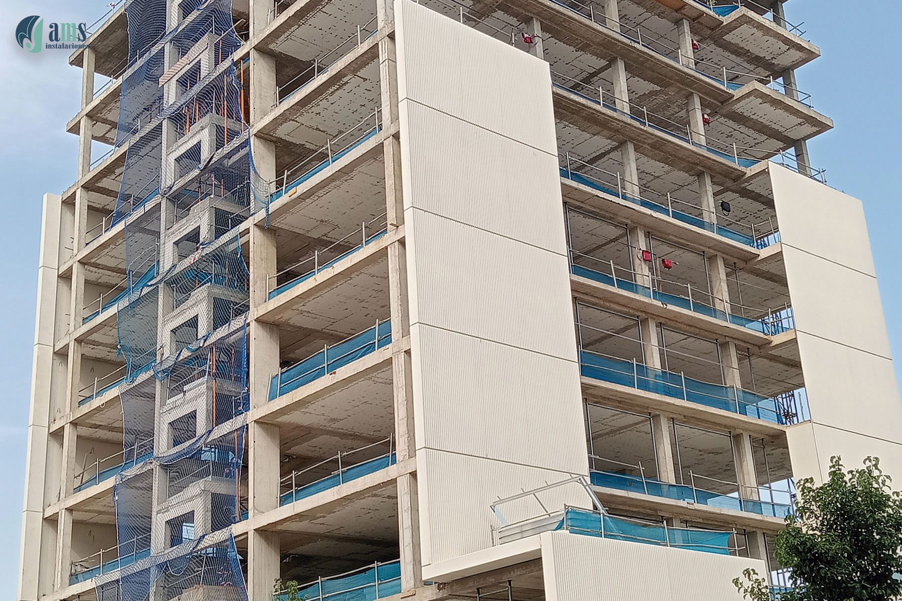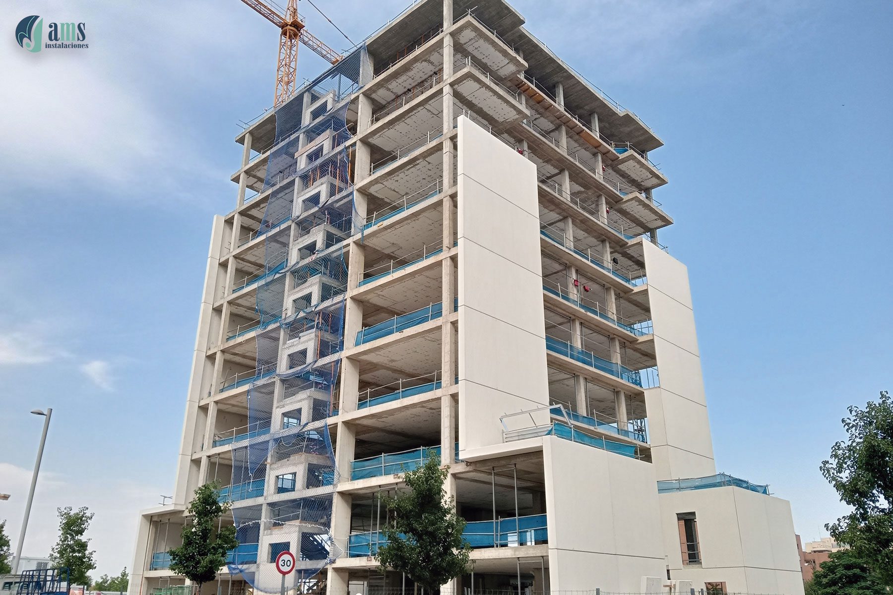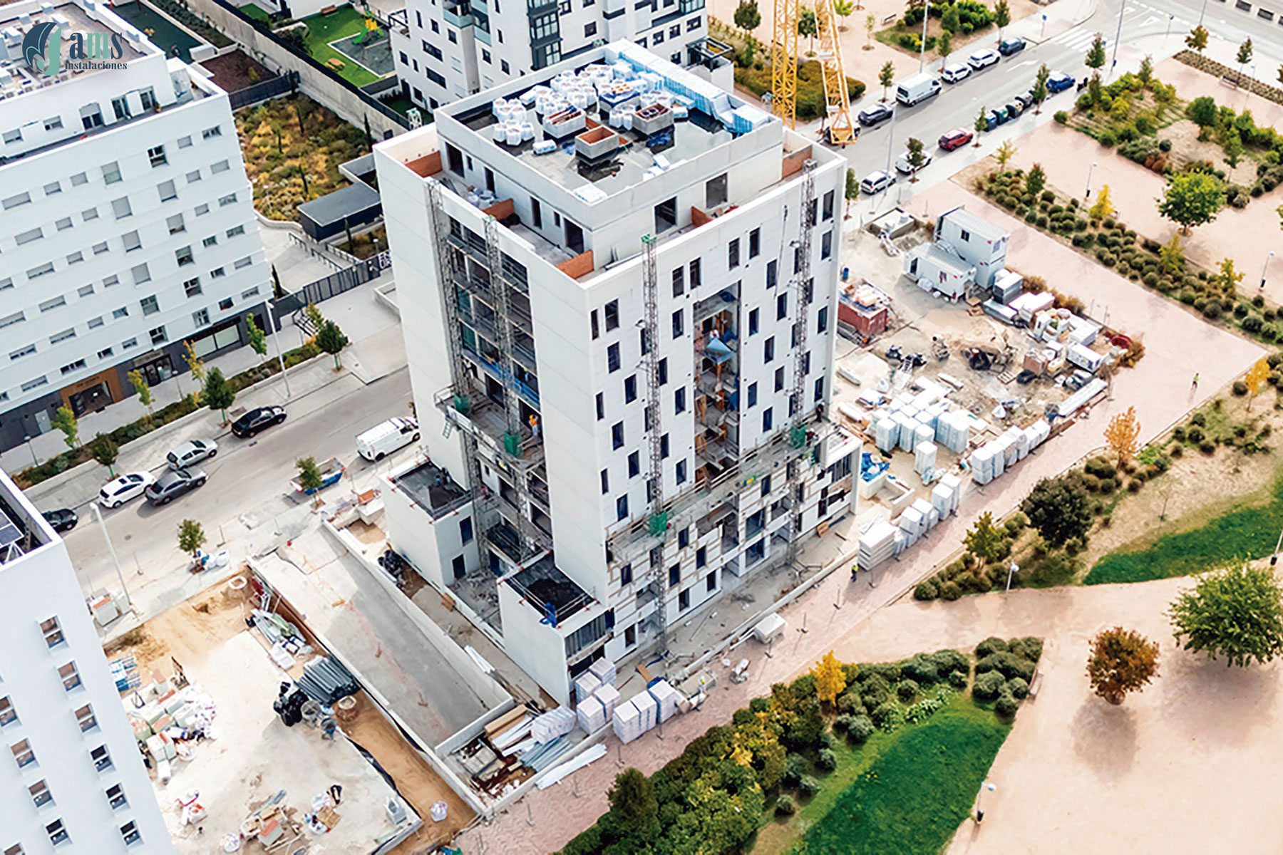 En la zona conocida como El Cañaveral, ubicada a medias entre Vicálvaro y Madrid capital cerca de Coslada, nuestra instaladora AMS Instalaciones está ejecutando en la obra de construcción de 45 viviendas los sistemas de yeso laminado (tabiquería, trasdosados, falsos techos), los aislamientos térmicos asociados, la fachada ligera a base de paneles de cemento aligerado Aquapanel y las soluciones de compartimentación relacionadas con la protección pasiva contra incendios del edificio.